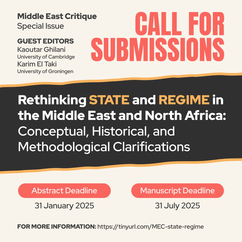 This special issue addresses the persistent conceptual confusion around ‘state’ and ‘regime’ in academic literature on the modern Middle East and North Africa (MENA). Much of the existing scholarship on the region has deployed these terms short of a conceptual distinction effort. Notions such as the ‘deep state’ (al-dawla al-ʿamīqa) are commonly used inside and outside academia to refer to some configuration of institutional and power relations that blur the lines between state and regime. Similarly, usages of ‘al-makhzan’ in Morocco, ‘le pouvoir’ in Algeria, or ‘al-sulṭa’ in Lebanon, seem to reproduce political discourses that may obscure more than they reveal. It remains unclear whether these terms describe varieties of the same political reality or entirely distinct phenomena.